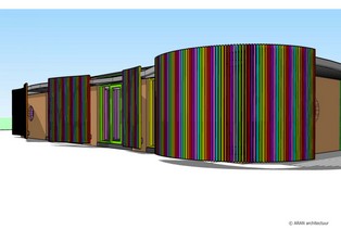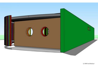 Materialen: gebogen voorzetgevel met vertikale lamellen in kleuren van regenboog, kozijnen idem gekleurd, stuc- en schilderwerk op gevel, ronde vensters toegevoegd, "groene" zijgevel, horizontale lamellen onbehandeld, zwarte epoxycoatingvloer binnen, binnenkozijnen in kleur.